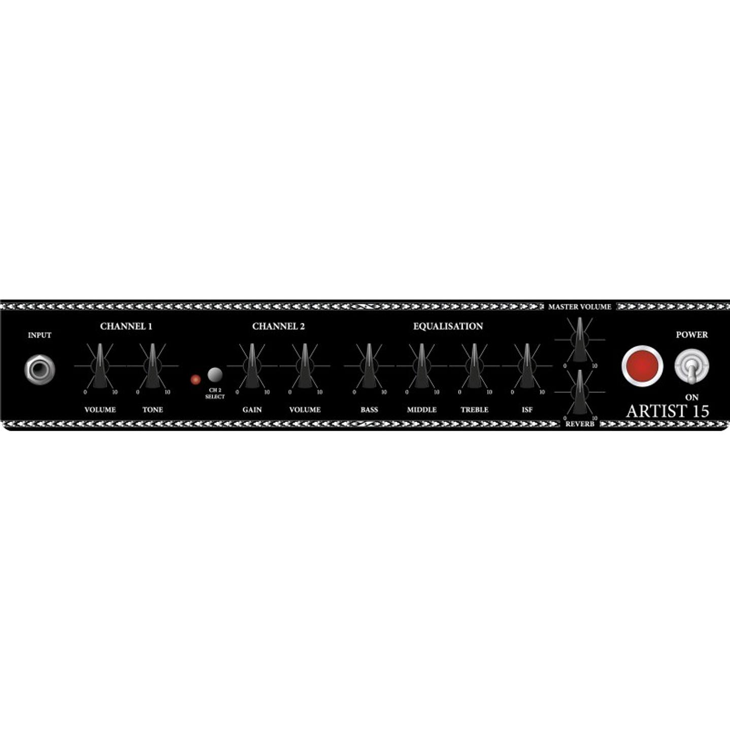 | Controles: | Canal 1 - Volumen y Tono, Canal 2 - Gain y Volumen, EQ - Bass, Mid, Treble, ISF, Reverb, Volumen Maestro |